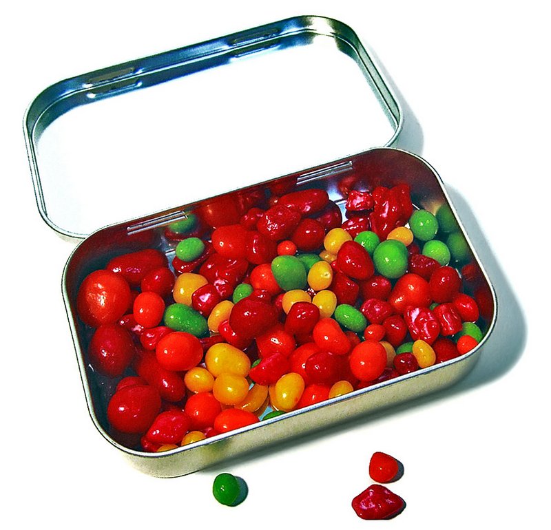 В металлические баночки могут помещены практически любые конфеты, которые подходят по размеру: леденцы, монпансье, мятные драже, мармелад, конфеты M&M's.