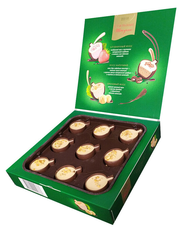 Воздушный мусс и дробленые орешки в изящной формочке в виде чашечки порадуют ваших деловых партнёров или в новогодние праздники. Вес: 104 грамма. Размер коробочки 17,2*17,2*3,4 см.