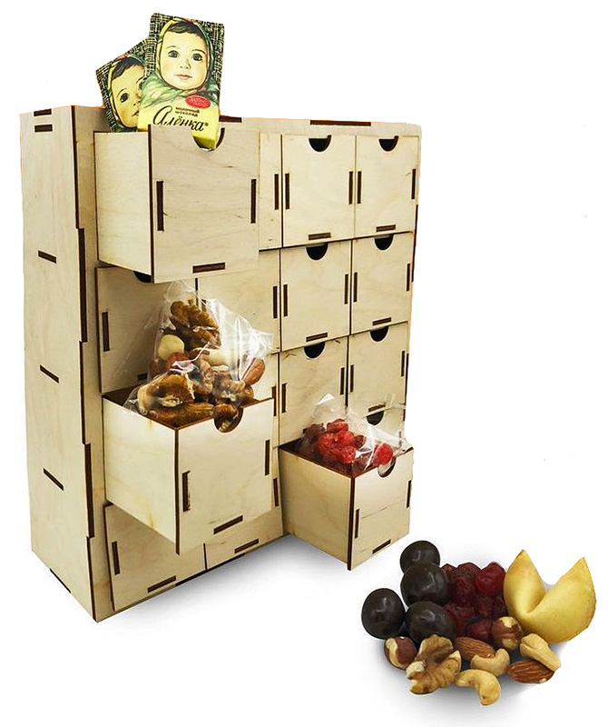 Каким должен быть новогодний корпоративный подарок? Созданным по индивидуальному заказу, неповторимым, вкусным. У нас есть такой. Действительно уникальный новогодний подарок — деревянный бокс со съедобными сувенирами. Такой презент может быть таким, каким вы захотите. Шоколад, конфеты, печенье, орехи, ягоды, чай, кофе, освежающие драже, небольшие шоколадные фигурки, леденцы — наполнить выдвижные ящички можно любыми вкусностями, которые туда поместятся. Украшенный корпоративной символикой бокс — отличный презент для самых важных клиентов и особенных бизнес-партнёров, ведь это по-настоящему эксклюзивный новогодний набор.